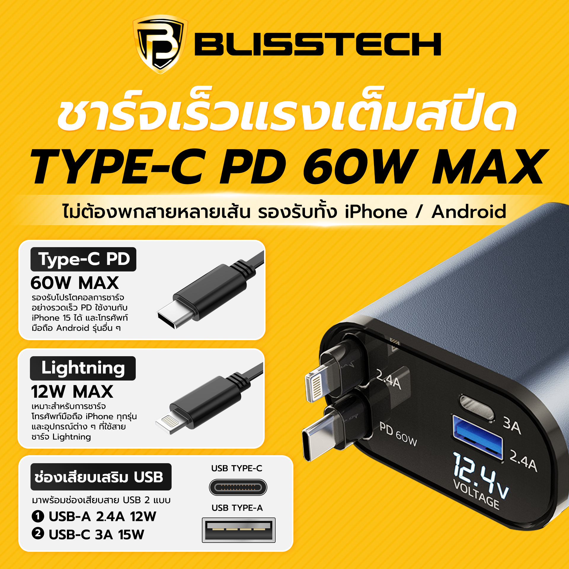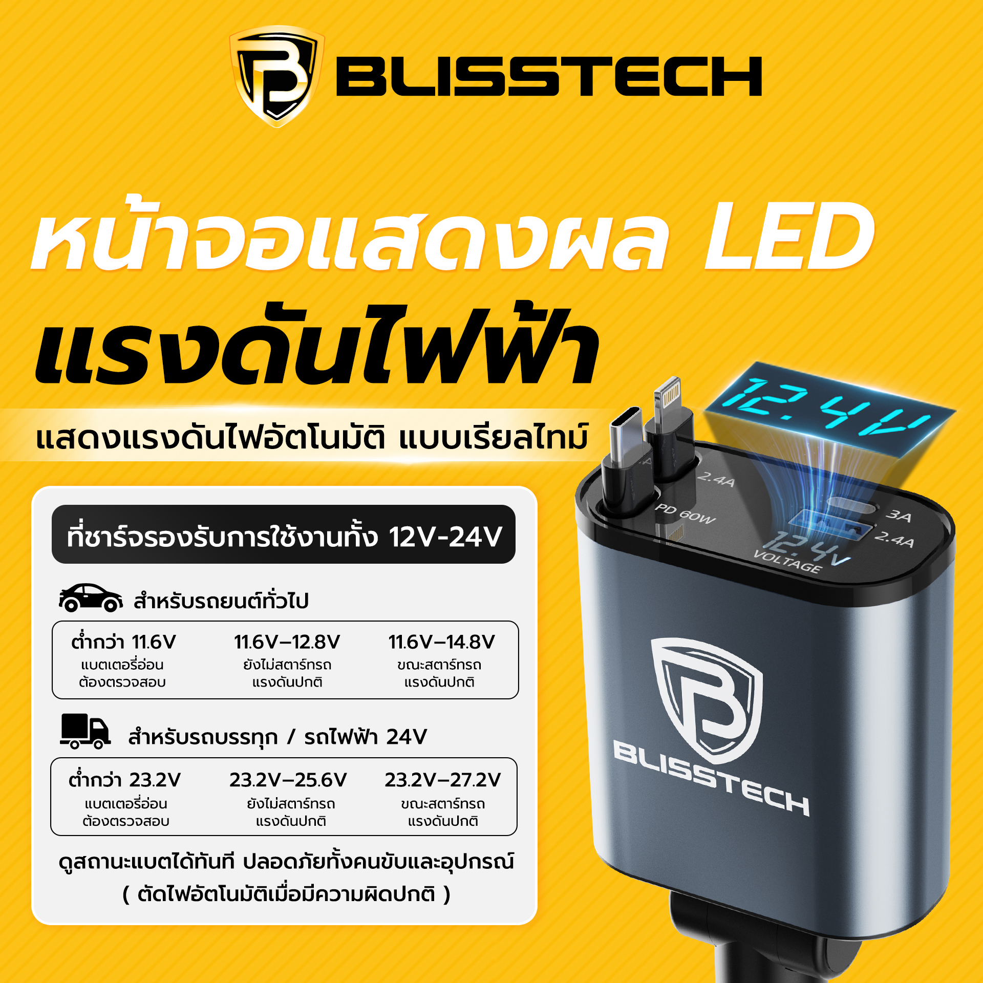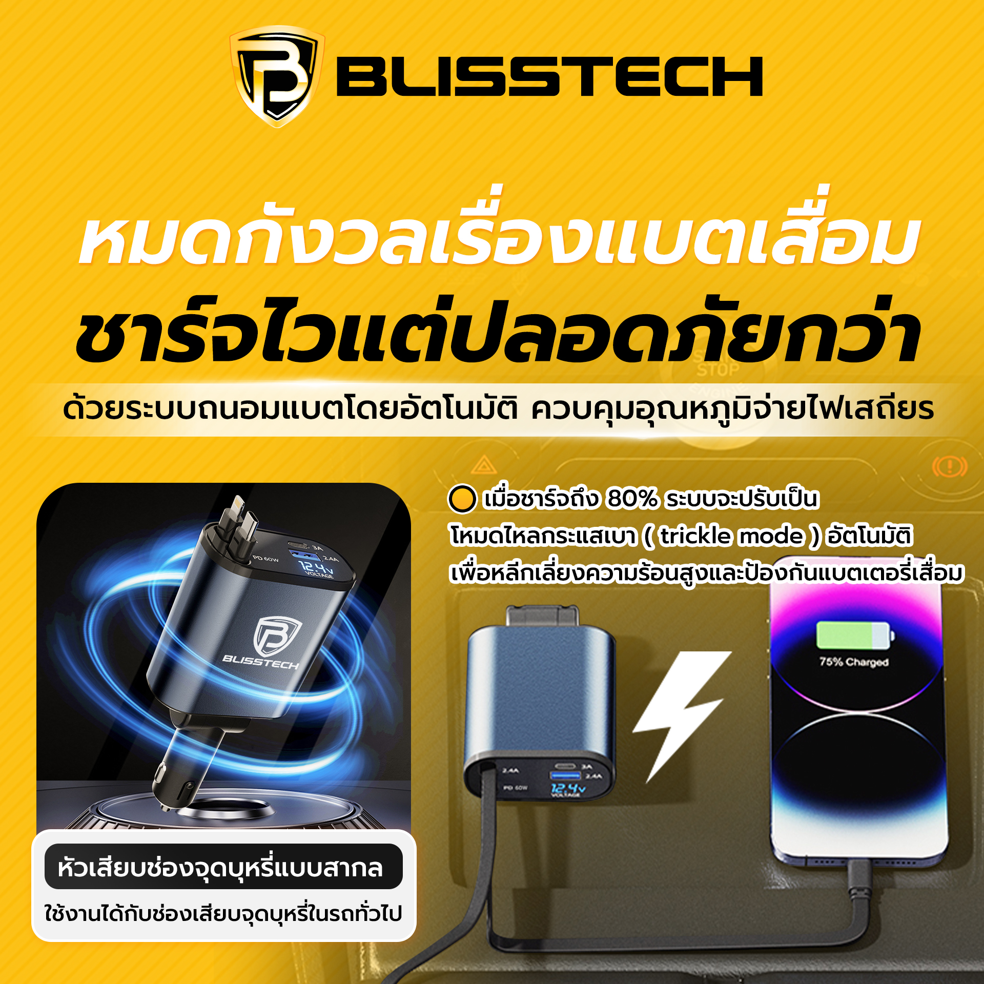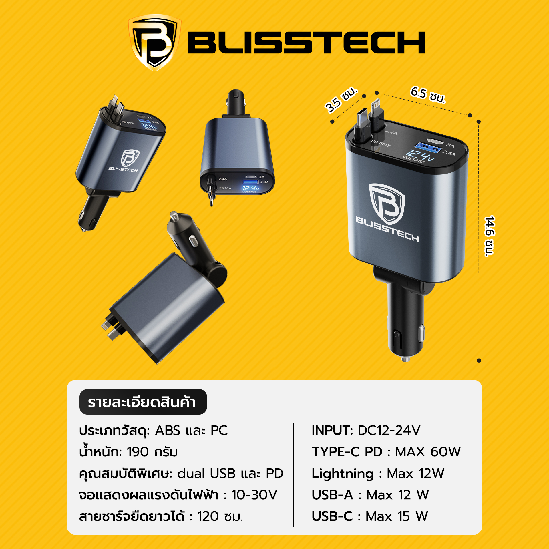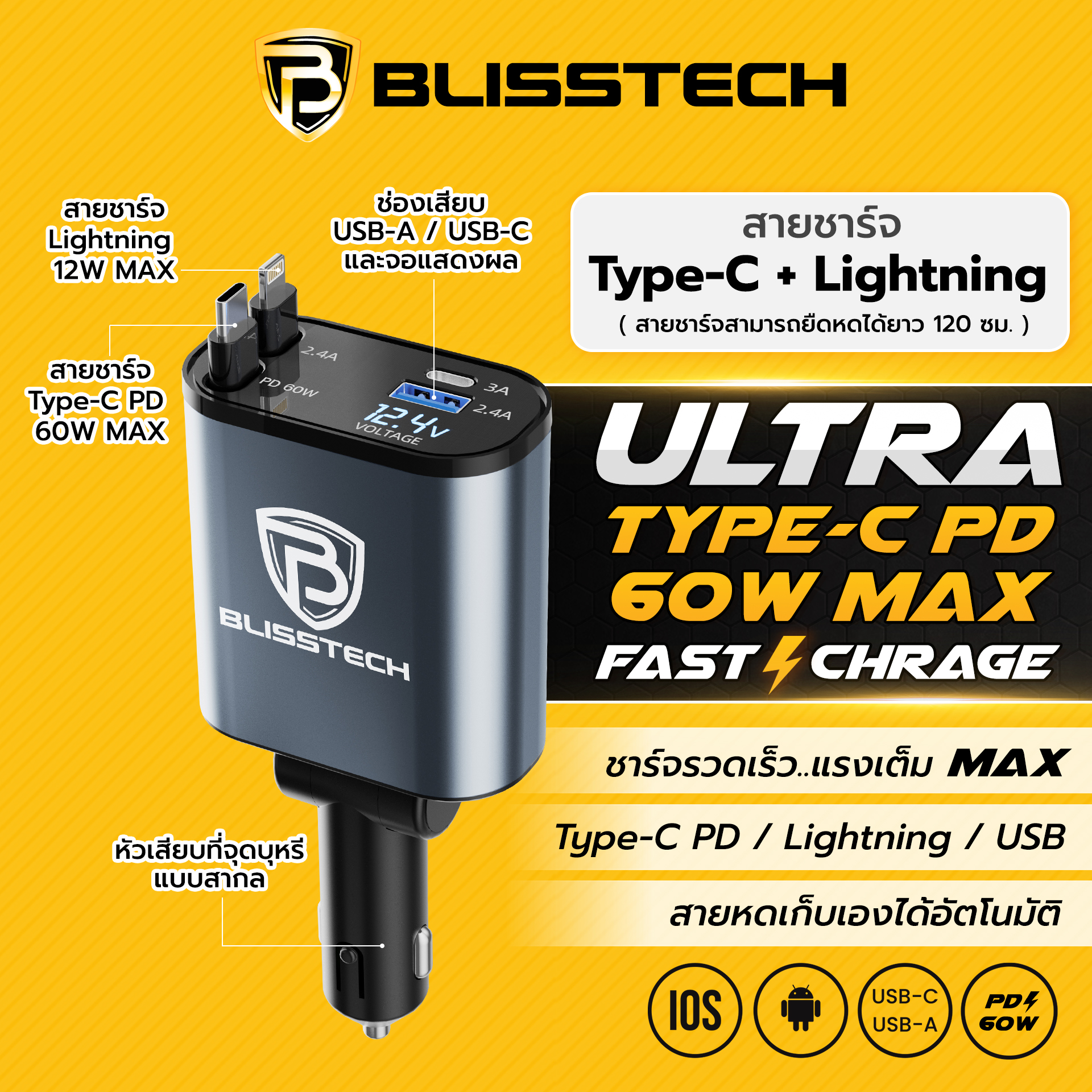 ที่ชาร์จในรถยนต์ BLISSTECH รุ่น ULTRA-CL 60W FAST CHARGE สายชาร์จยืดหดได้ 120ซม. TYPE-C / LIGHTNING / USB-A / USB-C